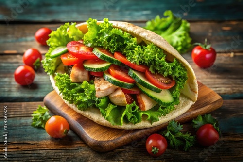 Surreal Pita Sandwich, Chicken, Lettuce, Tomatoes, Cucumbers, Food Photography, AI Art