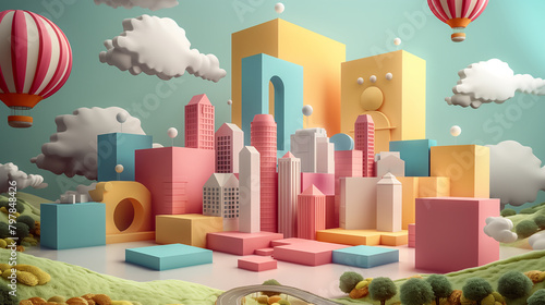 Surreal playful pastel urban landscape 3d background, a miniature paper model city composed of various geometric shapes and forms to create a cityscape