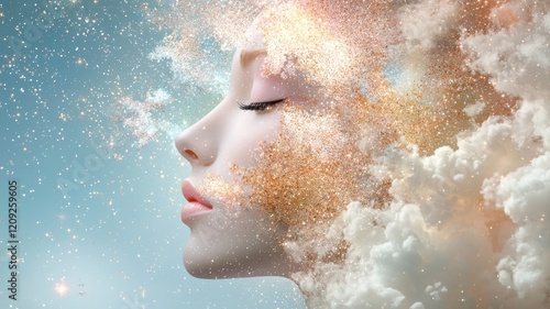 Surreal portrait blending a woman's profile with clouds and cosmic elements.