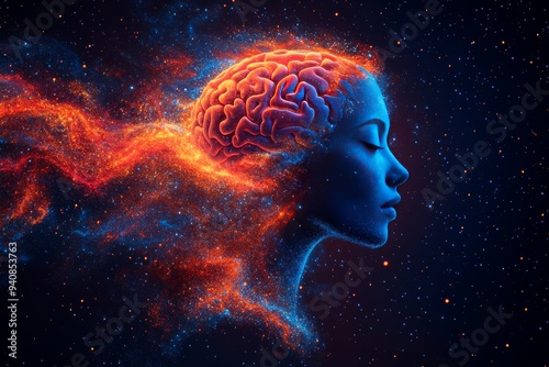 Surreal Portrait of a Woman with a Brain on Fire in a Cosmic Background: Representing Cognitive Intensity Thought Processes and the Energy of the Human Mind