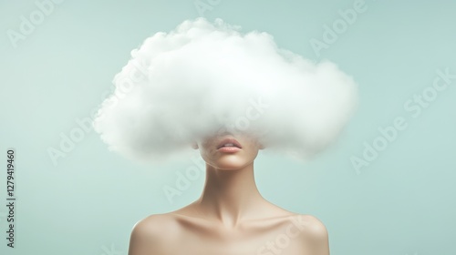 Surreal portrait of a woman with a cloud covering her face, symbolizing confusion, stress, and an overload of thoughts, representing mental health challenges