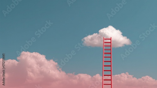 Surreal red ladder leading to white cloud against pastel blue and pink sky, a symbolic artwork of ambition, dreams and ascension, perfect for wallpaper, poster or inspirational design.