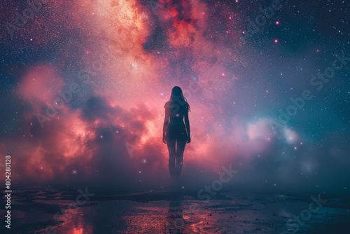 Surreal scenery of a lone woman against an expansive cosmic backdrop evoking mystery and wonder