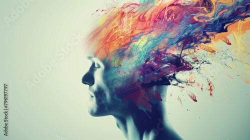 Surreal Side Profile of a Man with Vibrant Colorful Paint Explosion Flowing from Head Representing Creativity and Imagination