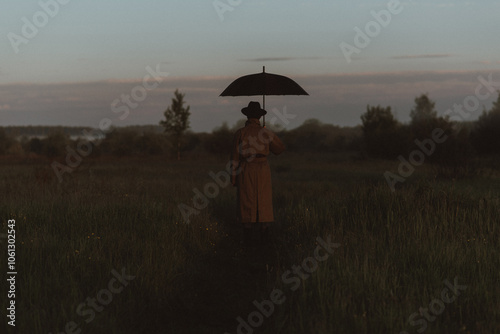 surreal silhouette of a man in a suit with an umbrella, standing in a raincoat in a field. The concept of freedom