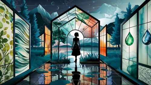 Surreal silhouetted figure contemplating destiny in glowing doorway amid stormy sea