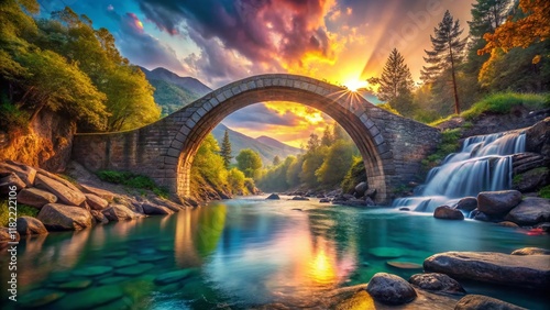 Surreal Stone Bridge Arching Over Dreamlike Waterway