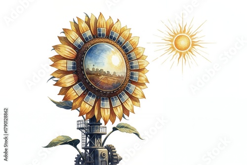 Surreal sunflower with a landscape inside and sun in the background solar thermal power plant