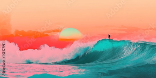 Surreal Sunset Surfer Ocean Wave Art Pink Teal Orange Hues, digital art style, illustration painting