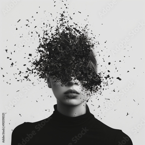 Surrealistic portrait of a woman with a flared face in black and white. Abstract art and emotional expression