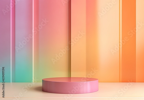 Surrounded by an exuberant display of pastel colors, a surreal pink round platform stands boldly against a vibrant indoor wall