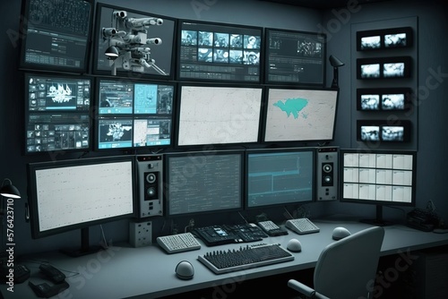 Surveilence monitoring workplace with many screens. Control room.