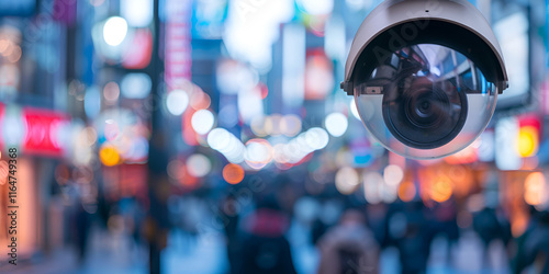Surveillance camera monitoring a crowded urban street at night, Security camera on city street with blurred pedestrians in background