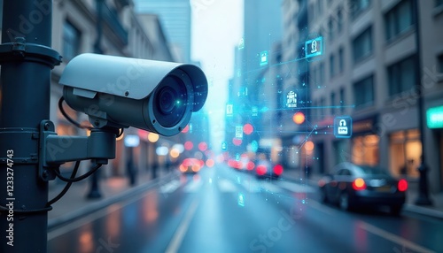 Surveillance camera monitoring urban traffic city street digital security rainy environment eye-level view safety concept