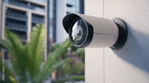 Surveillance camera mounted on a wall with a blurred background. Security and protection.