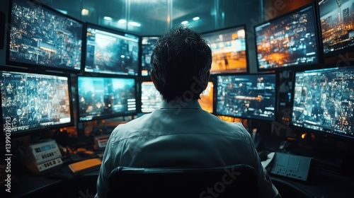 Surveillance Operator Monitoring Multiple Screens in a HighTech Control Room