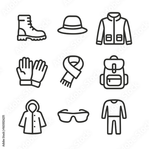 Survival Clothing Icons. Outline icon set of survival clothing: boots, hat, jacket, gloves, scarf, backpack, raincoat, sunglasses,