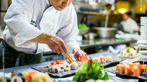 Sushi chef meticulously preparing a vibrant assortment of sushi rolls