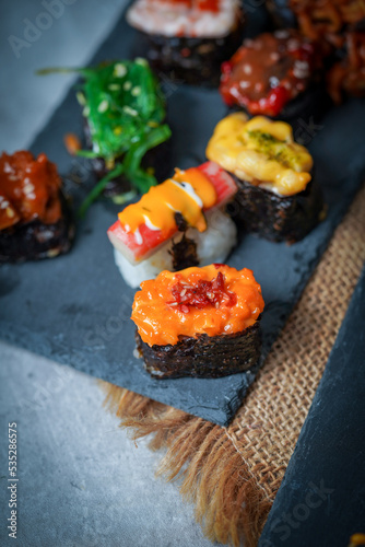Sushi is a Japanese dish of prepared vinegared rice (鮨飯, sushi-meshi), usually with some sugar and salt, accompanied by a variety of ingredients
