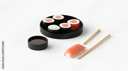 Sushi platter with soy sauce and chopsticks