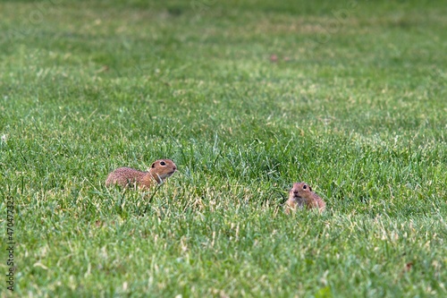 Susły moręgowane pośród trawy (Spermophilus citellus)
