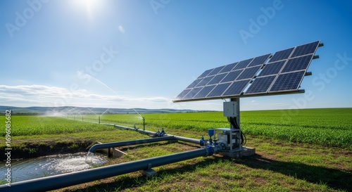 Sustainable agriculture powered by solar energy irrigates lush green fields under a bright blue sky