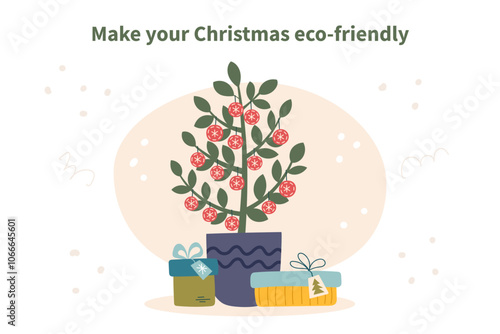 Sustainable Christmas concept. Eco friendly Christmas decoration. Decorated houseplant with gift boxes.