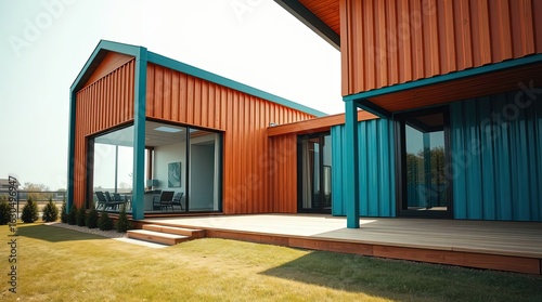 Sustainable Container Living: Sleek Metal-Wood Structure with Green Lawn & Sunny Exterior Generative AI