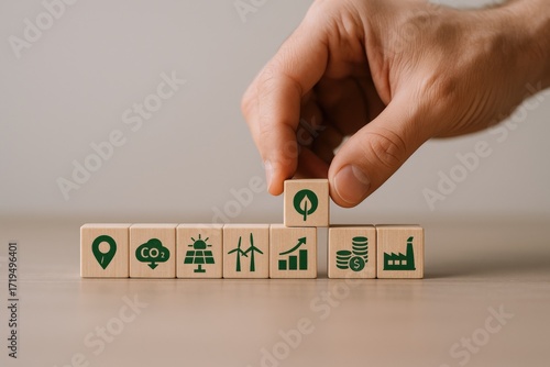 Sustainable Development Concept: Hand Arranging Wooden Blocks with Green Energy and Ecology Icons for Environmental Protection
