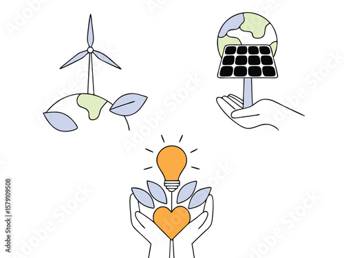 Sustainable energy illustration depicting wind turbines solar panels and bright ideas