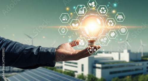 Sustainable energy innovation renewable power solar panel wind turbine eco friendly technology green environment clean electricity futuristic city