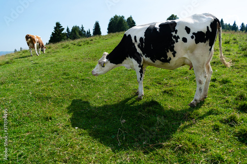 Sustainable farming, free grazing cow in mountain meadow. Dairy cow profile grazing in the open air