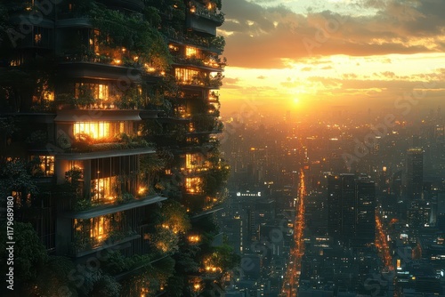 sustainable futuristic metropolis with vertical gardens, solar-powered skyscrapers, and integrated green spaces creating an eco-urban paradise