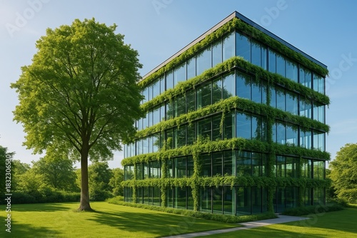 Sustainable green building with trees integrated into glass architecture Ecofriendly office CO reduction and environmental innovation concept