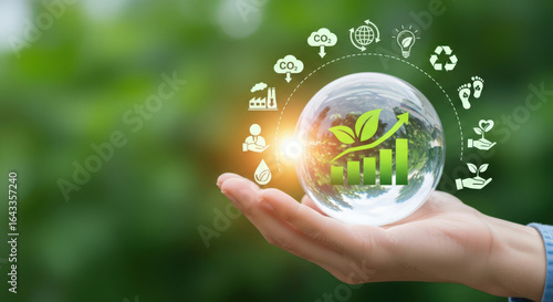 Sustainable Growth Concept Displayed in a Crystal Ball Held in Hand with Green Icons Representing Eco-Friendly Practices and Environmental Responsibility for a Better Future