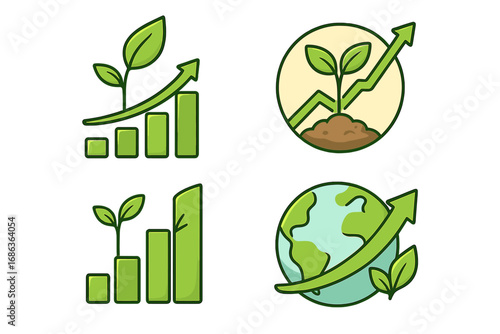 Sustainable Growth Icons with Eco-Friendly Themes and Green Energy Concepts, Vector Cartoon Illustrations, Plant Growth Charts, Earth and Environment Symbols, Transparent Background, Ordered Set