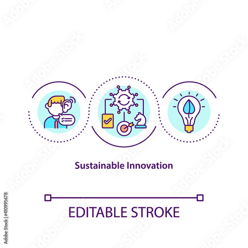 Sustainable innovation concept icon. Integration of consumer ideas into the innovation process of company idea thin line illustration. Vector isolated outline RGB color drawing. Editable stroke