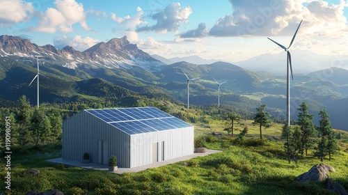 Sustainable Mountain Home Solar Panels, Wind Turbines, 3D Render, Eco-Friendly Design Sustainable Living, Green Energy