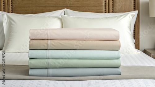 Sustainable pet linens elegantly folded on a bed, featuring eco-friendly materials and soft colors.