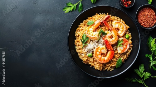 Sustainable seafood risotto with organic brown rice, shrimp, and parmesan shavings