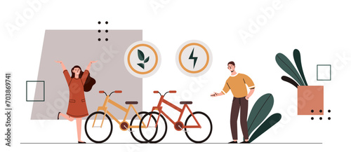 Sustainable transportation concept. Man and woman with bicycle. Eco friendly transport. Care about ecology and environment, nature. Cartoon flat vector illustration isolated on white background