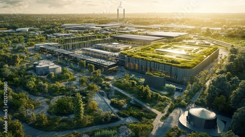Sustainable Urban Development: Aerial View of Carbon-Neutral Industrial Park Surrounded by Greenery and Futuristic Architecture