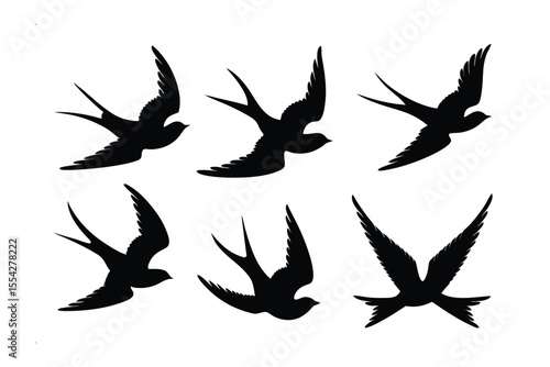 Swallow Flight Silhouette: A striking flock of swallow silhouette in various graceful positions against a bright scene. Evokes a sense of freedom and elegance.