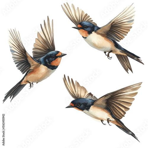 Swallows in mid flight with detailed wingspans isolated on transparent background.
