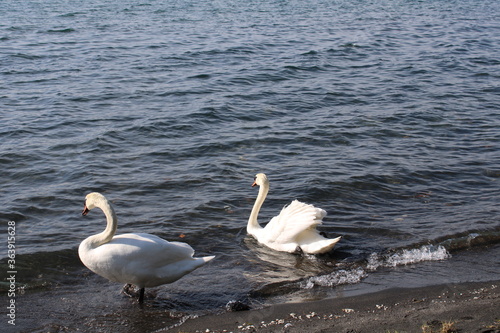 swan on lake with blue lake water in background