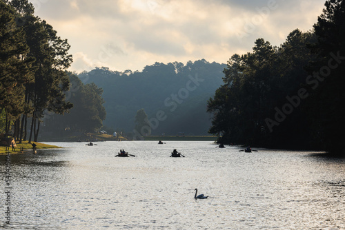 swan swimming and Silhouette group of tourists are rafting in morning sunlight at reservoir Pang Ung landmark mea hong son province, Thailand,