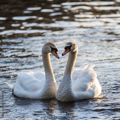 Swans on lake, close-up, looking at each other. For love themes
