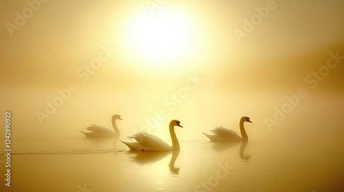 Swans swimming sunrise misty lake serene peace