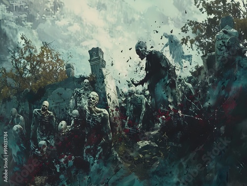 Swarming Shambling Zombies Emerging from an Overgrown Cryptic Cemetery in Muted Digital Painting