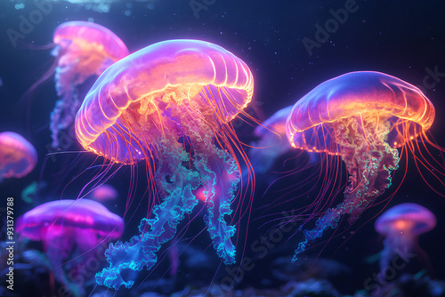 Swarms of jellyfish rendered in neon colors, pulsing and glowing in a dark ocean